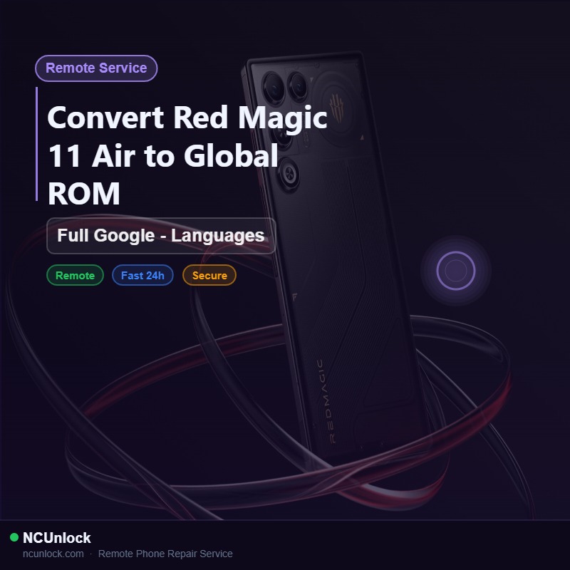 NCUnlock provides professional Red Magic 11 Air Global ROM conversion through remote service using UltraViewer or AnyDesk, ensuring privacy, safety, and full Google Play support. Our fast and secure process is usually finished in 20–30 minutes. The Red Magic 11 Air Global ROM service eliminates all Chinese apps and adds complete Google services integration.